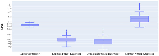 Figure 19 reports the performance of the DD model when implemented using different machine learning regression models. Among the models, the gradient boosting is the best performing one, and for this reason, it is selected to implement the DD model. As a second step, we replicate the previous analysis to select the machine learning regression model for the implementation of the hybrid model. Figure 20 reports the performance of the hybrid model when implemented using different machine learning regression models. In this case, the gradient boosting and linear models are the best performing ones. By comparing their learning curves in Figure 21 and Figure 22, it is possible to observe that the linear regression model is already robust against overfitting once trained with three or more samples. Furthermore, in Figure 20, if we use the median values as reference points, it is possible to observe that multiple regression models (e.g., linear regressor, gradient boosting regressor) have lower MSE than the PoF and DD models. This result suggests that the hybrid model for monitoring the health index of the package is able to achieve better performance than the ones obtained by the PoF and DD models alone.