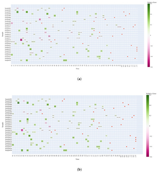 Evolution of the prognostic performance for each step change of each test curve. The y-axis reports the test curves, whereas the x-axis reports the time stamps uniformly binned (in time windows of 41 time stamps). The color and number of each square highlight to what extent the RUL forecast is delayed or early. The red circle reports the true end of life of the package. Figure (a) reports the prognostic performance using Equation (3); figure (b) reports the prognostic performance using Equation (4).