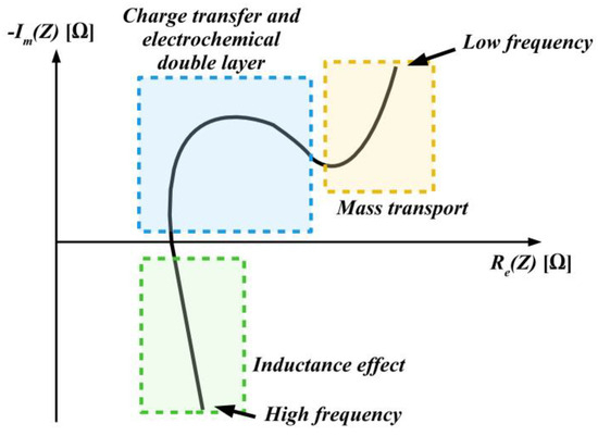 The Nyquist plot illustrates internal reactions of the battery. Its analysis results, consisting of components such as resistors, inductors, and capacitors, are similar to other response plots with these three components. The response varies depending on the frequency of the applied perturbation. Figure 3 provides a schematic Nyquist plot that illustrates the impedance effects within a battery system.