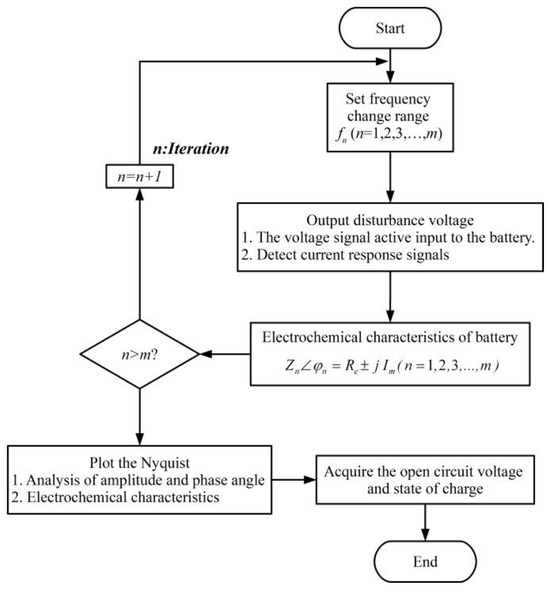 During the constant potential perturbation detection experiment, the battery responds with a corresponding current due to the perturbation voltage. By detecting the amplitude and phase angle of the current and adjusting and converting signal values, the connection between the perturbation voltage and the corresponding current, considering both magnitude and phase, can be calculated. This process provides the impedance and phase angle. The measurement continues until the specified frequency range is covered. After completing the measurement, the analysis of AC impedance parameters can begin. Figure 4 depicts the flowchart outlining the process of AC impedance analysis.