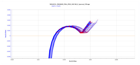 The AC impedance analyzer utilized is the VSP-300 manufactured by Biologic (Seyssinet-Pariset, France). The battery experiments and result analysis are conducted using EC-Lab V11.30 software. Before measuring AC impedance, ensuring that the remaining capacity of the battery is 100% is crucial. In planning the AC impedance experiment, attention should be paid to adjusting the charge and discharge currents according to the specific battery. For example, in the case of the selected 2.8 Ah lithium-ion battery in this study, a charge or discharge current of 2.8 A represents 1C, indicating that the battery can discharge at 2.8 A for 1 h. The AC impedance of the battery is correlated with its remaining capacity. When conducting measurements, it is crucial to simultaneously consider both the accuracy of the remaining capacity and the required measurement time. In this study, a balance is struck between the accuracy of the battery’s ECM and the duration of the measurement. A precision of 1% remaining capacity is chosen for the AC impedance measurement. Before each electrochemical impedance spectroscopy (EIS) test, the battery undergoes a one-hour rest period to attain electrochemical equilibrium, thereby improving the accuracy of the experimental outcomes. The following section will elucidate the experimental settings for AC impedance analysis.
