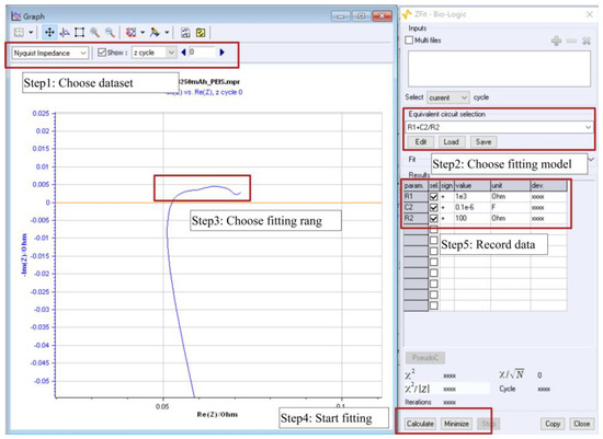 Following the AC impedance measurement, Nyquist impedance plots can be created for various remaining capacity levels, as depicted in Figure 6. The Z-Fit function in EC-Lab provides different ECMs that can be used to analyze Nyquist impedance plots according to specific requirements. This study employs the Warburg battery equivalent circuit model. The subsequent section offers a comprehensive explanation of the steps involved in analyzing AC impedance, with the operational interface depicted in Figure 7.
