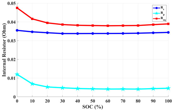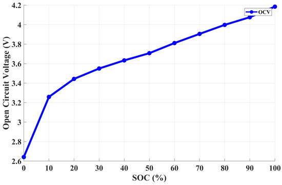 AC impedance provides essential foundational data for constructing equivalent circuit models. In every discharge cycle, the discharge is initiated at 1%, commencing rated capacity for initial experiments. Hence, a total of 101 data points can be obtained, spanning from 100% to 0% capacity. Figure 8 illustrates the relationship curve among Rs, Rp, and Req at various SOC levels. The Req is the sum of Rs and Rp. Figure 9 depicts the curve depicting the relationship of the battery OCV at various SOC levels.