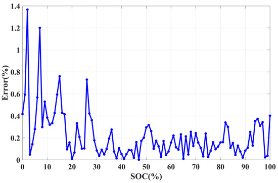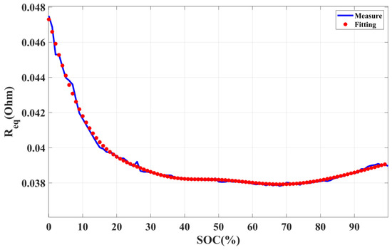 Table 2 presents the coefficients obtained from the curve fitting. Figure 10 compares the measured impedance with the fitted impedance, while Figure 11 illustrates the error relationship between measured and fitted impedances. The errors obtained in this study are all within 0.014%, validating the application of curve fitting to determine the equivalent impedance at various battery remaining capacities.