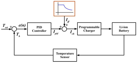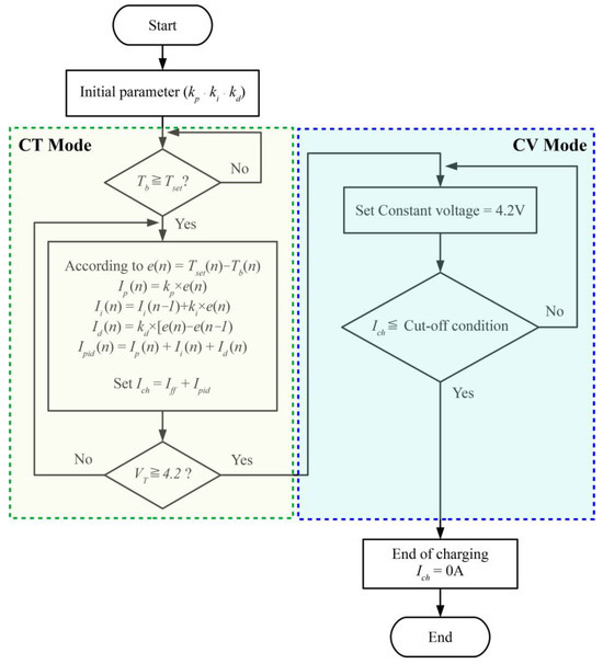 CT-CV is an improved charging method based on battery temperature. It utilizes closed-loop control to regulate the charging current. Generally, a higher charging current is required to achieve faster charging of lithium batteries. However, this can lead to increased temperature, and prolonged high-temperature charging accelerates capacity degradation and increases battery impedance [26]. The literature [26] proposes and implements the CT-CV charging technique for lithium-ion batteries. Under the same average TR, CT-CV charging saves 20% of CT compared with 1C CC-CV charging. Additionally, under the same CT, CT-CV charging reduces the average TR by 20% compared with 1C CC-CV charging. This indicates that it is possible to reduce CT without compromising battery life due to excessive TR. Control of the charging current is necessary to achieve acceptable TR at high currents. Figure 12 illustrates the control block of the CT-CV charging method.