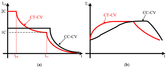 Schematic diagrams of (a) current profile and (b) TR for CT-CV and CC-CV.