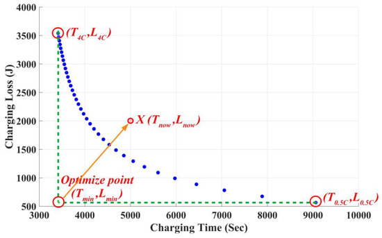 The fitness value can be used to confirm whether the found solution is optimal. The optimization method in this paper simultaneously considers both CT and CL as parameters. Hence, this section proposes a method to normalize these two parameters for seamless integration into a fitness value function for performance evaluation. This paper’s fitness value evaluation method utilizes the straight-line distance between two points as the score. Figure 15 illustrates the simulation graph of CT and CL for CC-CV charging from a 0.5C rate to a 4C rate. The fitness value is deemed superior if the distance d between the current point (T_now, L_now) and the ideal optimal point (T_min, L_min) is lower. The mathematical expression for the distance d between the two points is given by Equation (12).