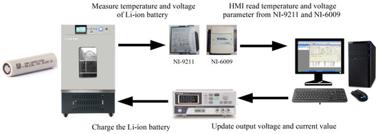 The charging equipment used for extended experiments in this study is the PSR 36-7 programmable power supply and human–machine interface produced by GW Instek (New Taipei City, Taiwan). It allows the configuration of various charging modes. The NI-9211 and NI-6009 measurement modules measure battery TR and voltage values during battery charging. The battery testing environment is placed inside the Desk-Top DDTH-080-20-BP-43 constant temperature chamber, with the ambient temperature set at 25 °C. Figure 16 depicts the experimental environment setup employed in this study.