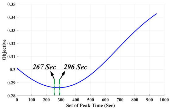 As shown in Figure 17, the adaptation value curves for different transition times in the basic CT-CV charging method are depicted. The calculated fitness values based on Equation (13) range from 267 s to 296 s, all approximately equal to 0.2861. Among them, the fitness value at 282 s is the lowest (0.286101). Therefore, this study will compare these three sets to demonstrate that the simulation yields the best-adapted solution, as indicated by the lowest adaptation value. Table 4 presents the simulation results for CL and CT after 0.5C and 4C CC-CV charging. These values represent the extremes of the CT and CL solution space. Therefore, these two point values are set as the maximum and minimum values for T and L when normalizing, i.e., T4C = Tmin, T0.5C = Tmax, L4C = Lmax, L0.5C = Lmin. Subsequent adaptation value calculations will use these parameters.