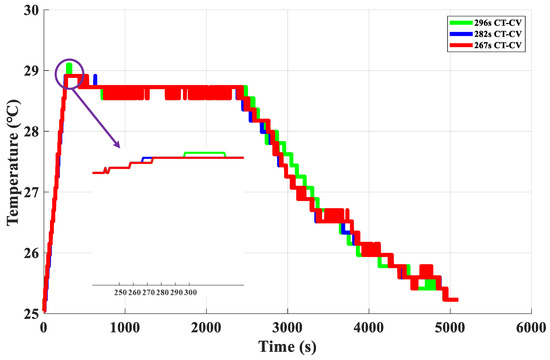 This section compares the three optimized transition times, which are 267 s, 282 s, and 296 s, respectively. The PID parameters used in this experiment are kp = 8, ki = 0.005, and kd = 0.1. Figure 16 and Figure 17 show the battery temperature waveform and charging current waveform for the three transition times of CT-CV charging. Table 4 compares the CT-CV charging effects for the three transition times. From Figure 18 and Figure 19, and Table 5, it is observed that the 296 s transition time results in a larger maximum TR due to the extended 2C CT. On the other hand, the 267 s transition time results in a longer total CT due to the short 2C CT. By calculating the fitness value with the CT and CL for each set of parameters, it is determined that the 282 s transition time yields the lowest fitness value. Therefore, the 282 s transition time is considered the loss-minimization CT-CV charging method.
