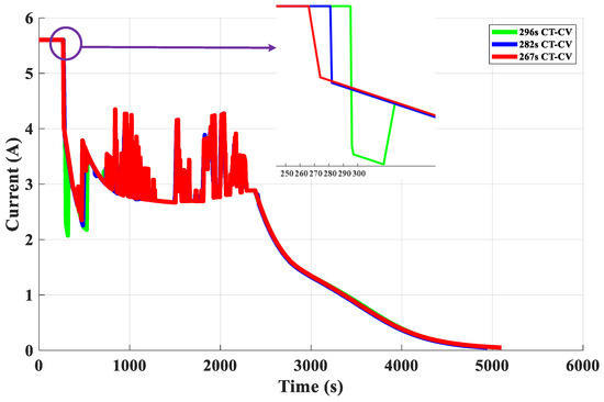 Comparison of the charging effects for three transition times in CT-CV charging method.