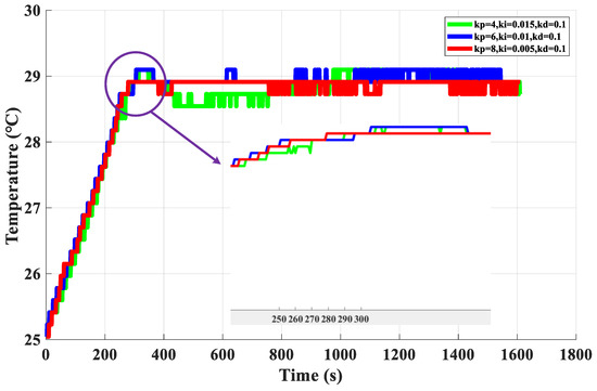 Comparison of three PID parameters to stabilize the battery at 28.9 °C.