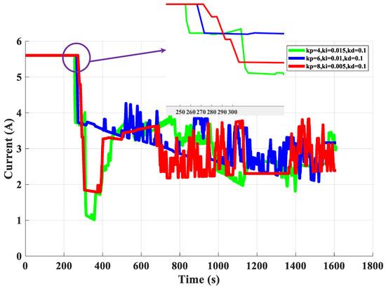Due to the Li-ion battery utilized in this paper, charging at 2C constant current for 282 s results in a battery temperature of 28.9 °C. Therefore, this section compares the performance of three types of PID value sets to maintain the battery temperature at 28.9 °C. The three sets of parameters are kp = 8, ki = 0.005, kd = 0.1; kp = 6, ki = 0.01, kd = 0.1; and kp = 4, ki = 0.015, kd = 0.1. Figure 18 and Figure 19 show the battery temperature and charging current waveforms for each PID parameter set, and Table 6 compares their performance in stabilizing the battery temperature at 28.9 °C. Based on Figure 20 and Figure 21 and Table 5, it is observed that the set of PID parameters kp = 8, ki = 0.005, and kd = 0.1 achieves the fastest stabilization at the set temperature with the least overshoot. Therefore, this set of PID parameters is used in all experiments in this study.