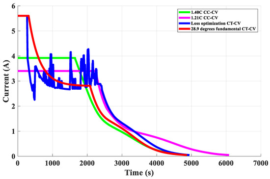 To ensure fairness in the comparison, this section compares the loss-minimization CT-CV charging method with the following methods: the basic CT-CV charging method with the same transition temperature of 28.9 °C, a 1.21C CC-CV charging method with an average temperature close to the loss-minimization CT-CV method, and a 1.40C CC-CV charging technique with CT close to the loss-minimization CT-CV charging technique. This comparison aims to validate the advantages of the proposed method. Figure 22, Figure 23 and Figure 24 show the temperature, current, and voltage waveforms for each charging method, and Table 7 presents a comparison of these methods. According to Table 7, the loss-minimization CT-CV method has the lowest adaptation value. Compared with the fundamental CT-CV charging method with the same transition temperature of 28.9 °C, the proposed charging method increases the CT by 1.56% but reduces the average TR by 12.01% and the maximum TR by 24.81%. In comparison with the CC-CV charging technique with the same CT, it improves the average TR by 28.45% and the maximum TR by 27.46%. Compared with charging methods with the same average TR, it reduces the CT by 18.64% and the maximum TR by 19.05%. The improvement percentage, as indicated in Table 6, is calculated based on the proposed method in comparison to other charging methods.
