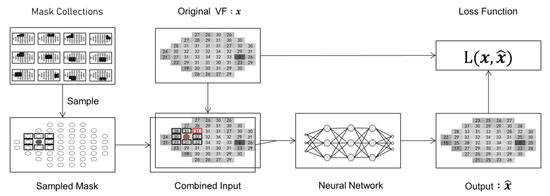 Framework of VF-Mask-Net. Mask collections are the mask set we constructed, which contain masks of different types and different parameters. For more information, refer to Figure 2. During the neural network training process, a mask is randomly selected from the mask collections to superimpose the original VF, , and to form the combined input of the neural network. In the example in this figure, the mask pixel of the circular gray shade is overwritten with the DLS value of the surrounding red rectangle. The mean square error between the output of the neural network, , and of the original VF is used as the loss function.