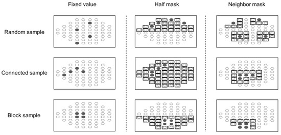 Different mask samples when the mask number takes the value of 4. The black solid circle is the mask pixel that needs to be covered, and the black hollow rectangular is a pool of options available for overriding the mask pixel. When VF is merged with the mask, the value of the solid pixel is overwritten and replaced with a pixel in the pool of options, and the other pixels remain unchanged.