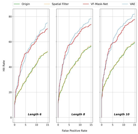 As depicted in Figure 4, the distance-based deterioration detection method illustrates a notable enhancement in the hit rate after noise reduction using VF-Mask-Net compared to the pre-denoising state. The hit rate curve of the spatial filter remains largely unchanged before and after noise reduction. The hit rate of VAE closely aligns with that of VF-Mask-Net. Specifically, as outlined in Table 3, the partial AUC of VF-Mask-Net increases by 0.17, 0.18, and 0.17, respectively, compared to the original value for VF series lengths of 6, 8, and 10. Furthermore, at FPRs of 5%, 10%, and 15%, the hit rate after VF-Mask-Net noise reduction is elevated by 21.3%, 20.0%, and 17.3%, respectively, compared to the original values.