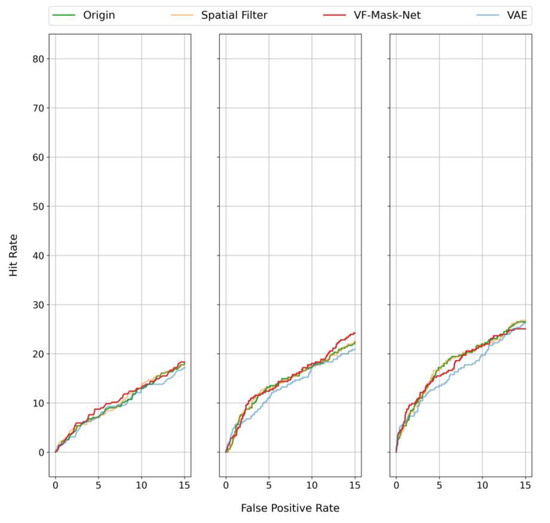 Furthermore, Table 3 presents the partial AUC results for other noise reduction methods. It is evident that the partial AUC of VF-Mask-Net surpasses that of the conventional spatial filter and the neural network approaches DnCNN and VF2VF. Notably, VF-Mask-Net ranks second, only being bested by the optimal outcome achieved by VAE under the current deterioration detection method.
