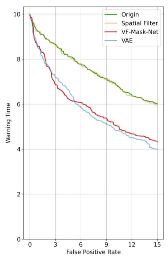 Another index indicating sensitivity, warning time, was also subjected to comparisons. As illustrated in Figure 6, when the FPR ranges from 0% to 15%, the warning time curve of VF-Mask-Net remains consistently stable and lower than the warning time curve before noise reduction. This signifies that in clinical practice, at the same error probability, VF data denoised by VF-Mask-Net consistently provide an early warning 1.73 times ahead of the original data. Comparatively, spatial filter leads by 0.02 times, DnCNN leads by 1.35 times, VF2VF leads by 1.77 times, and VAE leads by 2.03 times. VF-Mask-Net ranks second, only being bested by the optimal outcome, VAE.