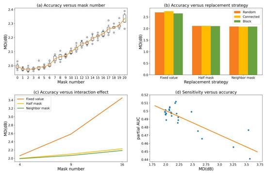The impact of different mask factors on accuracy and the relationship between accuracy and sensitivity. (a) The impact of mask number on accuracy. The boxplot displays the 5% quantile, quarter quantile, median, third-quarter quantile, 95% quantile of the test point. The solid orange line fits the mean value of the results at each test point. (b) The impact of replacement strategy on accuracy. (c) The impact of the interaction effect of mask number and replacement strategy on accuracy. (d) The fitting results of partial AUC and MD based on orthogonal test results. The blue dots describe the corresponding results of the partial AUC and MD of the orthogonal experiments, and the orange line represents the regression curve fitted based on these results.