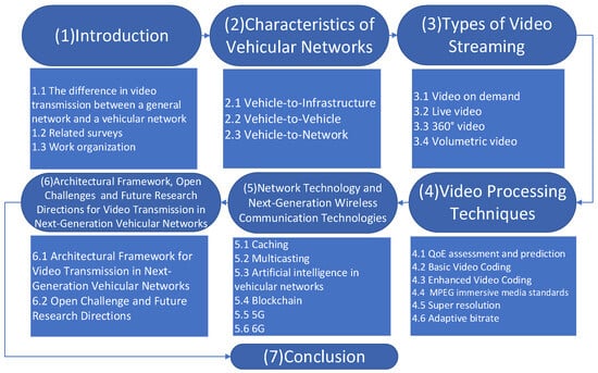 The subsequent sections of this article are organized as follows: Section 2 will delve into research issues relating to vehicular networks. Utilizing existing survey literature on V2X, this section will address the current challenges that are faced by vehicular communication. Section 3 will provide an overview of various video types, ranging from traditional flat videos to the latest immersive videos. In Section 4, a detailed exploration of technologies that are aimed at reducing video bandwidth will be presented, covering common encoding standards and compression techniques. Additionally, this section will introduce technologies for enhancing video resolution and adaptive adjustment of video resolution and bandwidth. Advancing to Section 5, strategies and communication technologies that optimize vehicular network video transmission will be introduced. This section will discuss relevant existing research and provide a detailed overview of actively researched 6G technology, exploring how 6G communication technology in new frequency bands is applied to vehicular communication. Finally, Section 6 will integrate various emerging technologies and propose a future architecture for vehicular network video transmission. It will also discuss future research directions and potential challenges that may be encountered. The overview of each individual section is illustrated in Figure 1.