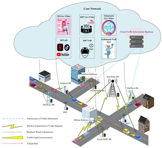 The Table 1 analysis highlights a dearth of research addressing vehicular network video transmission. A notable contribution comes from Jiang et al. [], who systematically explored resource allocation for video streaming in vehicular networks, emphasizing the integration of video communication, caching, and computation. However, this paper briefly introduced encoding techniques, lacking coverage of other video processing technologies and 6G-related content. Khan et al. [] examined caching strategies, computation offloading, and collaborative caching in video streaming with Mobile Edge Computing (MEC). While addressing challenges associated with 360° video transmission, they briefly touched upon related research on vehicular networks. However, their analysis lacked comprehensive discussions on volumetric video, video processing technologies, and the implications of 6G technology.