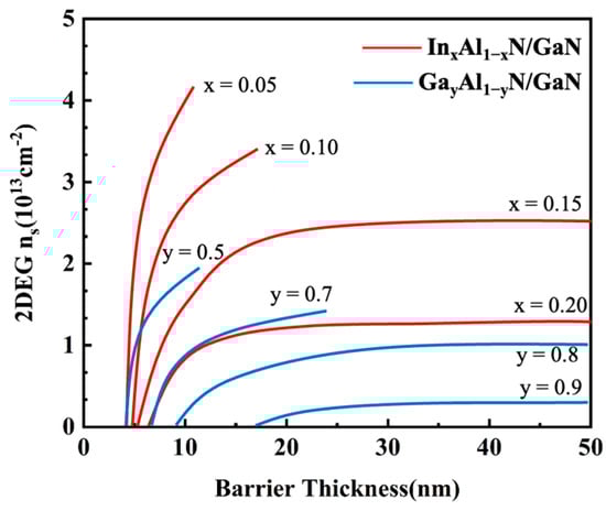 Two-dimensional electron gas (2DEG) density (ns) versus barrier thickness at different alloy compositions for InAlN/GaN HEMTs and GaAlN/GaN HEMTs.