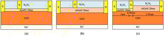Two-dimensional physics-based simulation is used to simulate the electrical performances of the proposed device, which is compared with the standard symmetric devices. Figure 2a,b illustrate the schematics of the standard symmetric devices which are composed of the same GaN buffer and 20 nm Al0.25Ga0.75N barrier and 10 nm In0.17Al0.83N barrier on top of the GaN layer, respectively. Compared with the conventional structures, the schematic of the proposed asymmetric GaN device is illustrated in Figure 2c. It is composed of the GaN buffer on top of the SiC substrate, and a 10 nm thick In0.17Al0.83N barrier layer at the source–gate side and a 20 nm thick Al0.25Ga0.75N barrier layer at the gate–drain side. The gate electrode is situated on top of the In0.17Al0.83N barrier. Ohmic contacts are formed in the source and drain terminals among the above three structures. The distances of gate–source, gate–drain, and length of the gate are 1 μm, 3.55 μm and 0.45 μm, respectively. The specific schematic diagram is shown in Figure 2c. The device’s surface is passivated by using Si3N4 thin film to reduce the current collapse effect in the HEMTs [17].