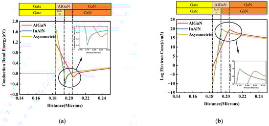 (a) Conduction band energy distribution and (b) electron concentration distribution for AlGaN/GaN HEMTs, InAlN/GaN HEMTs and asymmetric GaN HEMTs.