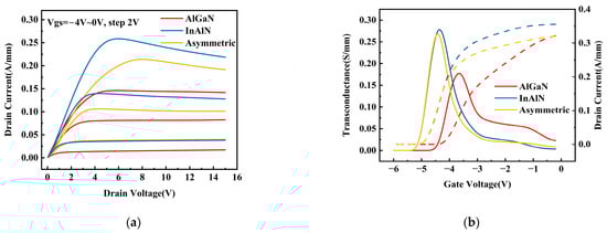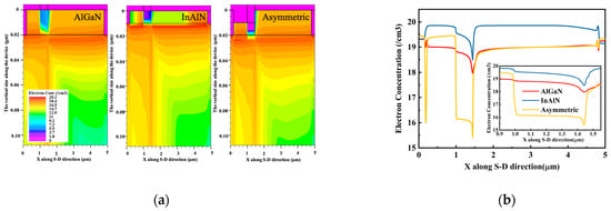 The asymmetric and symmetric devices are simulated using the same models and under the same conditions. The conduction band energy and electron concentration distribution diagrams for three different structures are presented in Figure 3a,b, extracted vertically from the gate electrode to GaN buffer cross-section, as shown in the upper part of the figure. It can be observed that asymmetric and InAlN/GaN HEMTs structures have a larger conduction band offset and therefore can polarize more carriers in the GaN channel, as shown in Figure 3b. The log electron concentration of the asymmetric device is similar to that of InAlN/GaN HEMTs and higher than that of AlGaN/GaN HEMTs (19.8 cm−3 vs. 19.4 cm−3), as shown in the inserted figure in Figure 3a.