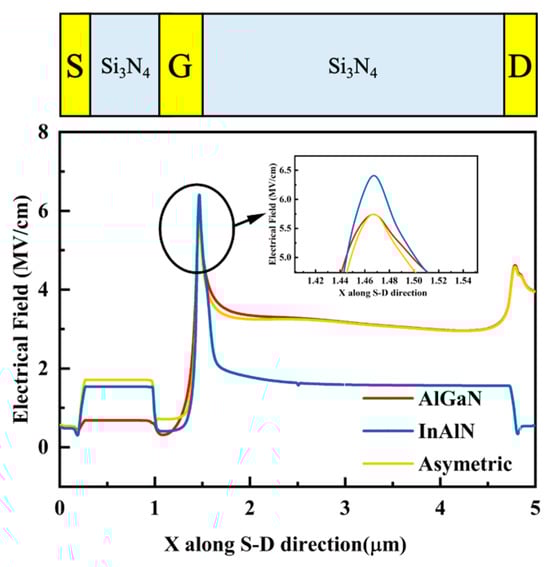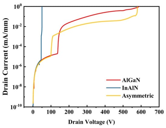 Although the InAlN HEMT structure offers significant benefits in terms of output drain current and transconductance, it is found through breakdown voltage simulation that it is most likely to break down (50.2 V vs. 580.5 V). Figure 5 shows the breakdown voltage (BV) characteristics of GaN HEMTs with different structures. During the simulation, the gate is biased at the off-state, and the drain voltages gradually increase until they reach drain current compliance of 1 mA/mm. It can be seen that the breakdown voltages of AlGaN barrier devices and asymmetric structures are much higher than those of InAlN barrier devices. The drain current starts to increase straight forward at VD about 50 V for the InAlN device, while the current starts to increase steeply at about 580 V and 575 V for the AlGaN and asymmetric devices separately. To investigate the breakdown phenomenon, electric fields are extracted along the source–drain cutline both in the barrier and in the channel for three devices to study their impact on the breakdown voltage.