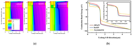 (a) Conduction band energy distribution and (b) its cutline plane distribution of AlGaN/GaN HEMTs, InAlN/GaN HEMTs and asymmetric GaN HEMTs at the on state.