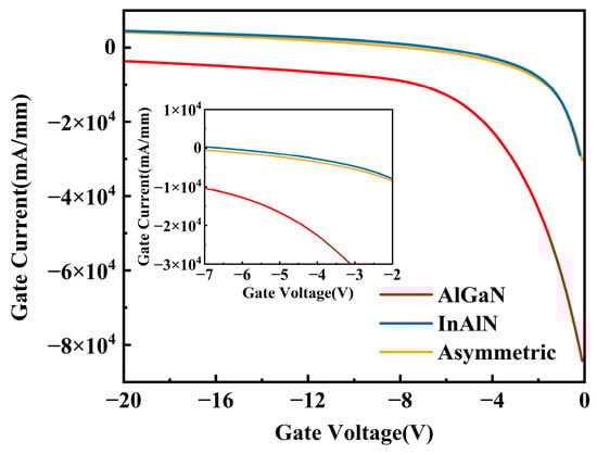 The reduced breakdown voltage of the InAlN/GaN HEMTs can also be attributed to gate leakage. Therefore, investigations of gate leakage have been carried out for three different structures. As depicted in Figure 9, gate leakage current is extracted at reverse gate bias from 0 V to −20 V. The results show that the InAlN/GaN HEMTs have significantly higher gate leakage compared to the AlGaN/GaN HEMTs (more than one order of magnitude difference), which on the one hand is due to their thin barrier thickness, and on the other hand is due to the tunneling probability of InAlN material being significantly higher than that of AlGaN material. This will cause the gate leakage current to increase and the device breakdown voltage to decrease. Interestingly, the overall gate leakage of the asymmetric structure is slightly lower even with the same thin InAlN barrier under the gate. We speculate that this could be due to mirror force mitigation, which is highly related to the electron concentration. As discussed in the previous part, the electron concentration has been highly reduced at the gate edge using asymmetric barrier; therefore the mirror force is reduced. Hence, the tunneling probability is also reduced.
