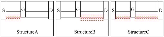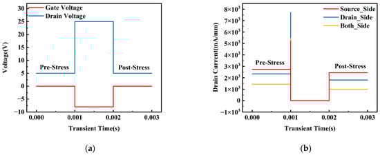 As shown in Figure 11, three AlGaN/GaN HEMTs are defined with different interface trap setups, which all have the same concentration of . Structure A has only source interface traps, which are acceptor-like traps at 0.8 eV. Structure B has only drain interface traps of the same type. Structure C has interface traps both at the source and drain. By separately investigating the position where the interface traps have the most impact, potential current collapse due to second epitaxial growth can be estimated. The quiescent bias is at VGQ = 0 V and VDQ = 5 V, and the devices are stressed at VG = −8 V and VD = 25 V for 1 ms, and then return to the quiescent state, as shown in Figure 12a. According to the simulation results as shown in Figure 12b, after only 1 ms of bias stress, the drain current is significantly reduced, demonstrating the current collapse phenomenon. By comparing three different structures, drain interface defects play a dominant role in current collapse effects. Considering only drain interface defects, the current collapse is 23.1%. Considering only source interface defects, the current collapse is 10.8%. Considering both source and drain interface defects at the same time, the current collapse is 30.8%. The current collapse is calculated by the equation below: