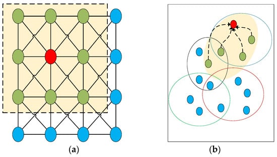 The hypergraph neural network also follows a neighborhood aggregation scheme, calculating the vector representation of the central node through recursive aggregation and transformation of the neighborhood node representations [14]. This process is accomplished by convolutional operators. In traditional neural networks, the convolutional kernel operates within an ordered, fixed-size neighborhood of nodes, as shown in Figure 3a. Hypergraph convolution, as illustrated in Figure 3b, aggregates the features of the red node and its neighborhood (i.e., nodes connected by dashed lines) through weighted aggregation. The neighborhood of nodes in the hypergraph is unordered and variable in size, making it challenging to obtain a unified convolutional kernel for convolutional operations.