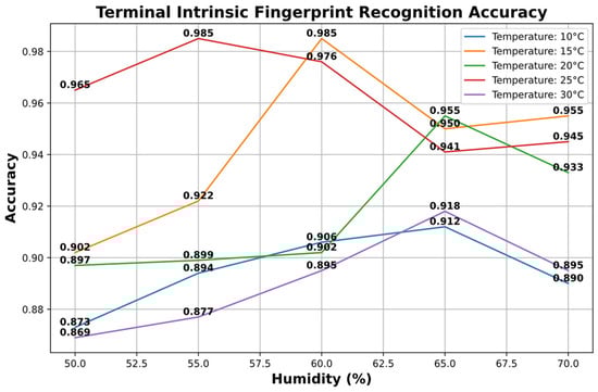 The experimental results depicted in Figure 6 articulate the model’s recognition accuracy for device intrinsic security fingerprints under varying room temperatures and humidity conditions. The comparison table presented below contrasts these data with the accuracy obtained from traditional direct CSI fingerprint recognition methods. It highlights the superiority of the proposed model in terms of adaptability and robustness across diverse environmental scenarios, from cold and dry to hot and humid, offering robust support for real-world applications under fluctuating climatic conditions.