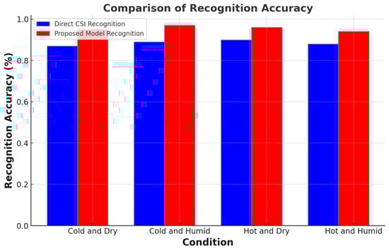 For ‘Cold and Dry’ conditions, the direct CSI method shows an accuracy of 87%, which is significantly improved to 95% by the proposed model. In ‘Cold and Humid’ scenarios, the direct CSI recognition stands at 89% accuracy, whereas the proposed model achieves a notable increase to 97%. The trend of improvement continues in ‘Hot and Dry’ conditions, where the direct CSI method records an accuracy of 90%, and the proposed model registers a higher accuracy of 96%. Lastly, under ‘Hot and Humid’ conditions, the direct CSI method’s accuracy is 88%, while the proposed model demonstrates a marked improvement with an accuracy of 94%.