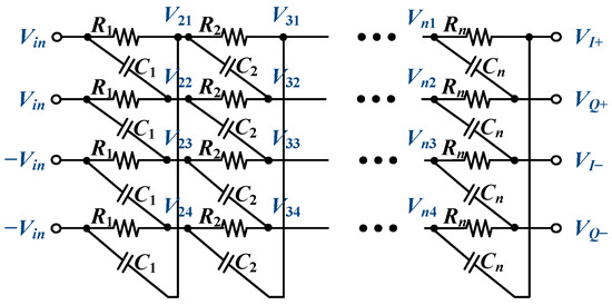 Next, advancing to the analysis of the multistage PPF, the voltage ratio between VI and VQ is determined by multiplying the matrix chains of each stage. Figure 3 illustrates the consistent multistage PPF matrix for both PPF-I and PPF-II.