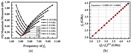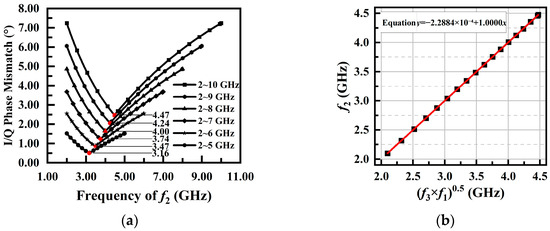 The sweeping result is shown in Figure 6a, where the pass band is also changed by increasing f3 from 5 GHz to 10 GHz to find the universality pattern. The abscissa is the frequency of f2 (in GHz), and the ordinate is the maximum I/Q phase mismatch throughout f1~f3 (in °). It can be seen that when the minimum full-band phase mismatch is achieved, f2 is always . The fitting function is shown in Figure 6b.