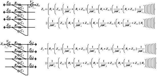 For multistage PPFs like three-stage PPF-I, to calculate the input impedance of the second stage, ZS is the impedance seen from the output node to the ground of the first stage, and ZL is the impedance seen from the input node to the ground of the third stage, which can also be obtain by Equations (18)–(20). To simplify the analysis, when calculating ZS and ZL, the first and third stages can be seen as disconnected with the second, as shown in Figure 12, where ZS1 is the impedance of the previous stage before the PPF, and ZL3 is the impedance of the next stage after the PPF.