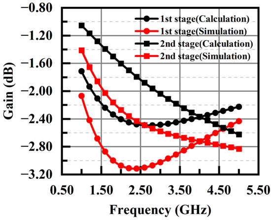 In order to verify the reliability of the model with examples, the theoretical results from the analysis above and circuit simulation of a two-stage PPF are shown in Figure 14. It can be seen that the calculated results of the theoretical model are slightly larger than the simulation results of the circuit, indicating that the actual voltage transfer model of the PPF should be more complex. However, this is a feasible model for roughly estimating the output voltage; it can guide designers in setting the indicators of the whole system and can facilitate the estimation of the circuit performance at the beginning of circuit design.