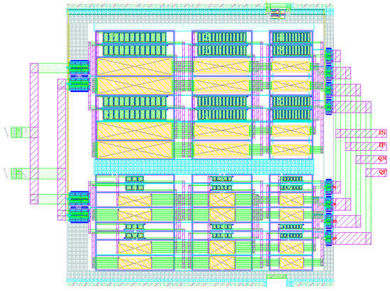 The layout of the final 2~8 GHz three-stage PPF in a 55 nm process is shown in Figure 17. The upper and lower parts work at 2~4 GHz and 4~8 GHz, respectively, and are switched by transmission gates. The area is 174 × 145 μm2. The resistors and capacitors used are shown in Table 1.