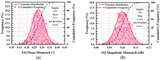 I/Q mismatch in Monte Carlo sampling for (a) phase mismatch and (b) magnitude mismatch.