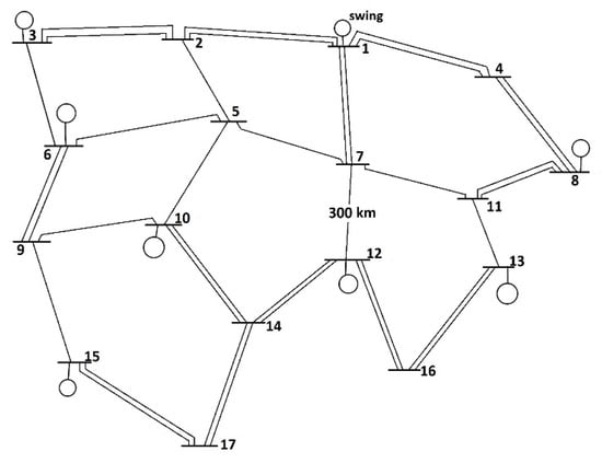 Figure 1 illustrates a network connection diagram of the 17-bus test system. In this configuration, bus 1 functions as a swing bus, whereas buses 3, 6, 8, 10, 12, 13, and 15 are identified as voltage-controlled buses (PV buses), with the remaining buses serving as load buses (PQ buses). The test system developed in this paper is not a real power system. It is a synthetic transmission network developed at a transmission level of 500 kV, especially for transmission expansion planning studies. The geographical locations of the buses depicted in Figure 1 dictate the accurate measurement of transmission line lengths, as detailed in Table 1. The assumed length of lines 7–12 is 300 km, serving as a reference for calculating the lengths of the other lines. Line 1–2 is comprised of two circuits, and the length indicated in Table 1 for this line, 512.90 km, signifies the length of each circuit. This characteristic holds for the other double-circuit lines depicted in Figure 1.