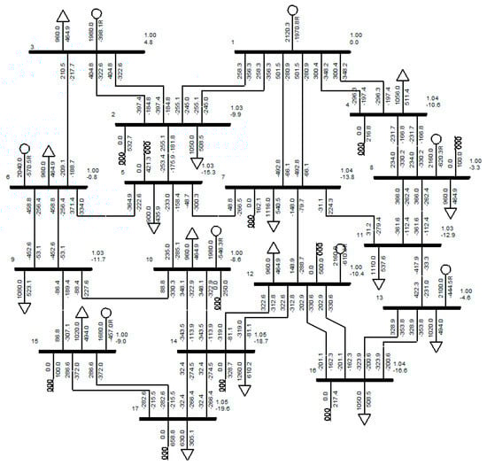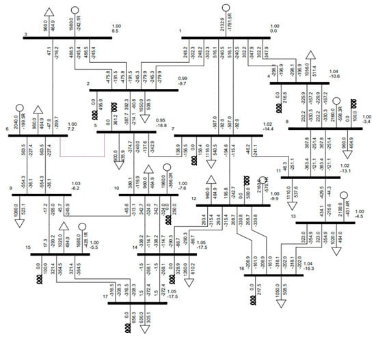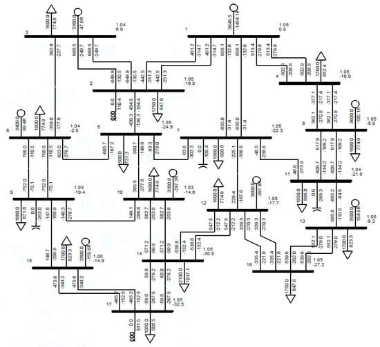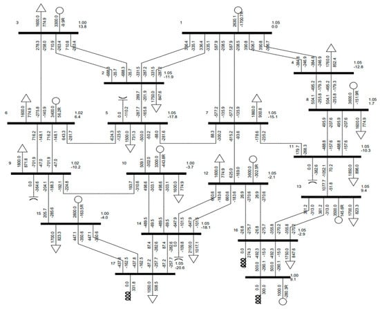 The power flow problem described in Equations (1)–(4) for the proposed test system, illustrated in Figure 1 and accompanied by generation and load data presented in Table 3 and Table 4, is solved by using the Newton-Raphson method. The analysis is conducted using the PSS/E 35.4 simulator. All the power flow results presented in this paper were convergent and met convergence tolerance. Figure 3 shows the power flow result for the 17-bus test system under normal operating conditions. In this power flow model, the numbers on the left and right sides of each transmission line/generating unit/load/shunt capacitor/shunt reactor show active and reactive powers, respectively. Positive and negative numbers mean the output and input powers to the bus connected to that transmission line, respectively; this is the opposite for generating units, shunt capacitors, and reactors. Numbers for each bus mean voltage magnitude, voltage angle, and bus number.