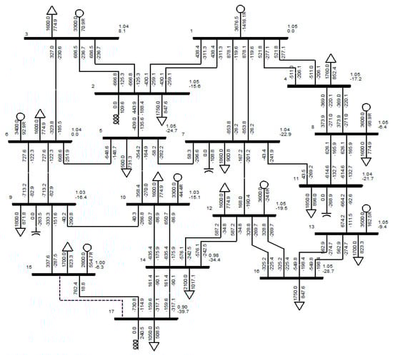 For the dominant loading condition, the generations and loads are taken as 60% of those of the peak loading conditions, and likewise, in the peak load condition, the power factors for all loads are taken as 0.9 lagging. For the generating units, each unit’s scheduled voltage has been set to 1.0 p.u., and reactive power generation limits have been set as defined in Equation (6). The loads and shunt compensator data for dominant loading conditions are illustrated in Table 7. Figure 5 shows the power flow result for the 17-bus test system at the dominant load under normal operating conditions. The load flow result is summarized in Table 8. It shows that the reactive power of all generating units and the voltage magnitude at each bus remain within the defined thresholds given in Equations (5) and (6). Lines 1–7 have the highest loadings (23.9%), followed by lines 6–9 (21.94%), and line 2–3 (21.6%). The remaining lines have line loadings below 20%.