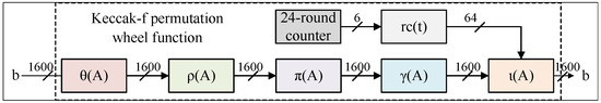 In the five steps mentioned above, the ranges for x and y are 0 to 4, while the range for z is 0 to 63. The value of varies based on the round number and is a 64-bit number. It can be observed that most of the internal steps within the round function involve simple shift or XOR operations, which are relatively straightforward and friendly to hardware. As a result, even without specific optimization techniques, the implementation of KECCAK-f[1600] demonstrates excellent performance. Therefore, this paper presents the hardware circuit depicted in Figure 4. The circuit is implemented using pure combinatorial logic without incorporating any pipelining design. The output of the previous sub-function directly feeds into the next sub-function, and the five sub-functions are serially cascaded to form one round. Unlike the other literature, this study does not involve simultaneous processing of data from multiple rounds, resulting in a parallelism factor of 1. The circuit of the round function processes 1600-bit data in one cycle, meaning that one round is completed within a single cycle, and the KECCAK-f operation requires 24 cycles. The overall circuit synthesis result is 2281 LUTs, consuming a reasonable amount of resources.