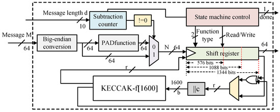 The message M is inputted into the SHA-3 module as a 64-bit serial data stream. At the same time, the module is informed of the length of the input data, which is assigned as the initial value of the subtraction counter. The module is also configured with parameters for the hash function, including r, c, and the padding constants. The original message M is converted to a little-endian format. When the subtraction counter reaches 0, message padding is performed, and the data are then entered into a shift register buffer. The buffer checks for empty/full conditions based on the configured bitrate parameter and XORs the r-bit data being iterated in KECCAK-f for message absorption. After being concatenated with the capacity to form b, the data enter the iteration function for computation. In the data writeback stage of squeezing, the data output by the iteration function is assigned to the shift register and serially output as a 64-bit stream. When the desired output data length is reached, the “” signal is raised, and the internal registers are cleared, thus achieving the implementation of three hash functions using a Keccak core in conjunction with peripheral circuitry.