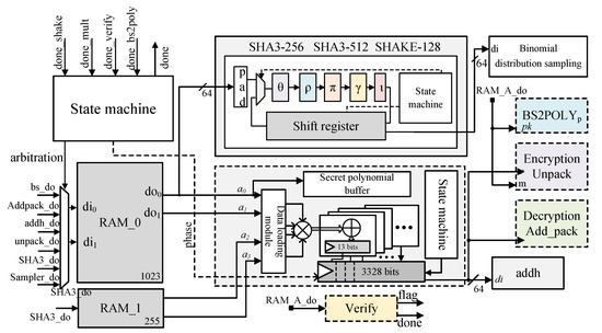 There are two main approaches to the hardware implementation of the mainstream Saber lattice cipher. The first approach is the coprocessor implementation, which includes a unified interface for each module [12]. Similar to the peripheral devices in a system-on-chip (SOC) system, these modules are connected to a 64-bit bus. The progress of the flow is driven by completion flags, and a dedicated 32-bit instruction set is designed to control the module, enable/disable signals, and read/write the starting addresses of the BRAM. External control is achieved through stimulus files, providing a high degree of flexibility but introducing more redundant cycles. The second approach is dedicated implementation, without the use of a bus [16,29]. The interface width between modules is not fixed, and the overall system is controlled by a predefined state machine. This approach is more efficient in terms of implementation, but it can only execute the predetermined flow defined by the designer.