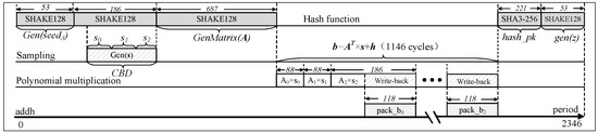 The overall circuit consists of three lightweight Schoolbook polynomial multipliers, two 64-bit-wide BRAMs ( with a depth of 1024 and with a depth of 256), a 4-bit-wide dual-port BRAM with a depth of 2048, a hash function module, three modules, and four other functional sub-modules, including . During the operation of the circuit, in the phase, the hash function module requires a 256-bit random seed as input. This seed is provided by the external user and is input into . The hash function then reads the seed from to generate an internal random seed. In the and functions, the hash function SHAKE-128 first generates pseudo-random numbers for the secret polynomials, which are stored in . It then generates coefficients for the public polynomials, which are also stored in . At the same time as generating the coefficients for the public polynomials, the binomial distribution sampling module initiates parallel operation. It requires two cycles to read data and in the write-back stage, 8 bits of data are serially shifted out per cycle. The total sampling period requires (2 + 8) × 48 + 1 = 481 cycles, which is smaller than the 687 clock cycles required for generating the coefficients of the public polynomials.